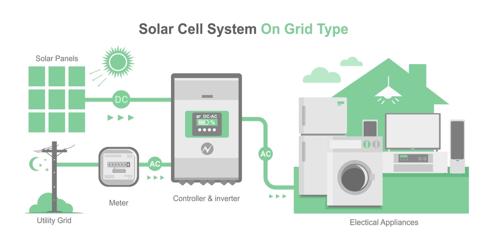 The on-grid system collaborates with the grid. You can utilise the grid-tied solar system to power any home appliance; there are no limitations. It also makes use of all the solar energy produced by solar panels. For instance, a 1 kW on-grid system may deliver 5 kW of power.